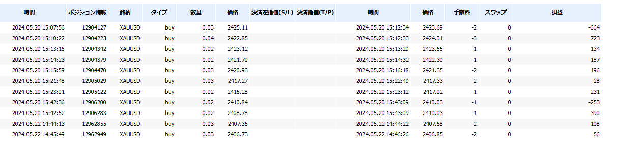 スキャルピングということで、ポジション保有時間は2分以内のものが多めです。