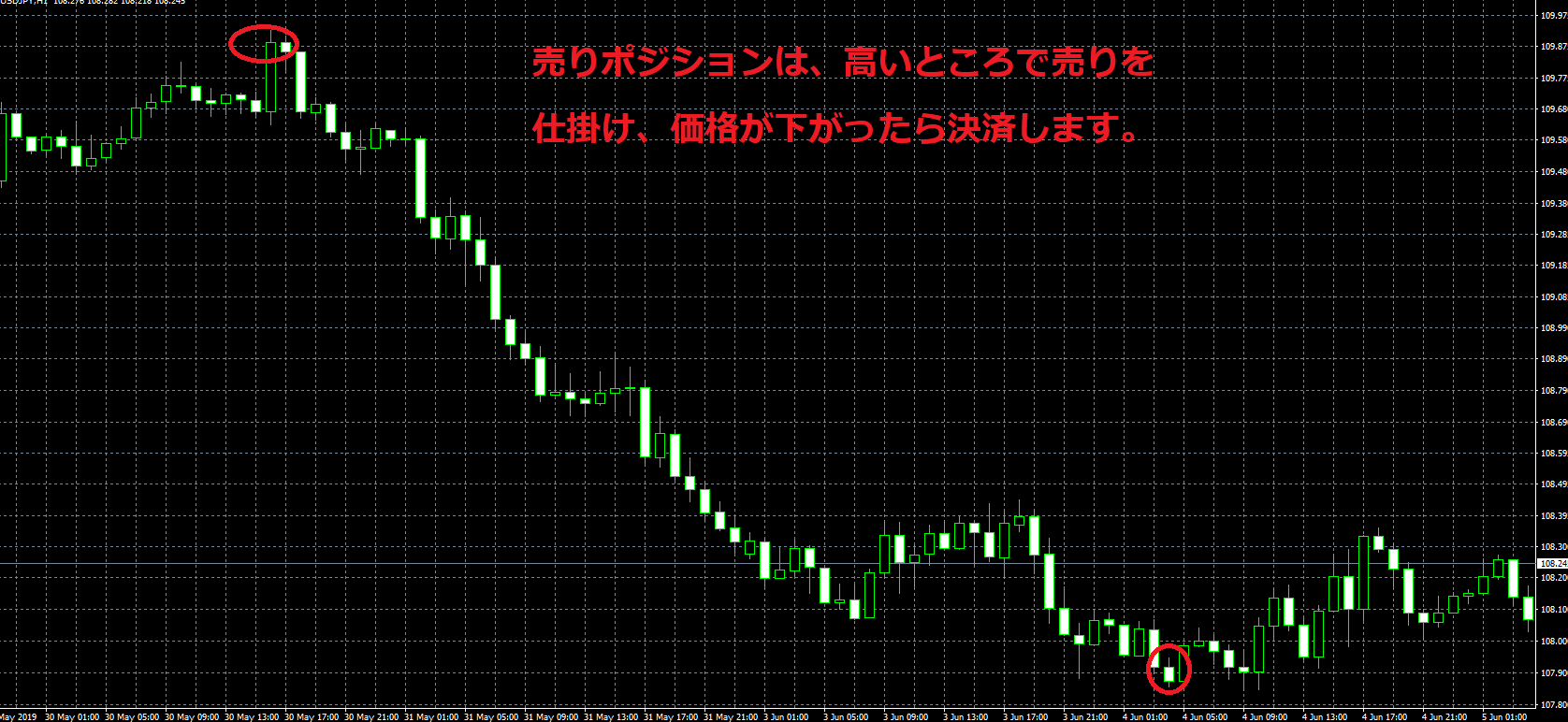 USDJPYの例の場合、ドルを売ることが売りポジションとなります。下の図はUSDJPYです。