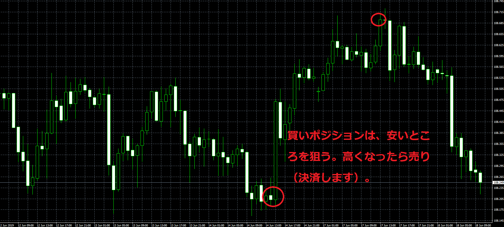 ドルが安い(円が高い)時にドルを買いポジションで入り、ドルが高い時(円が安い)時に売ることで利益を狙います。