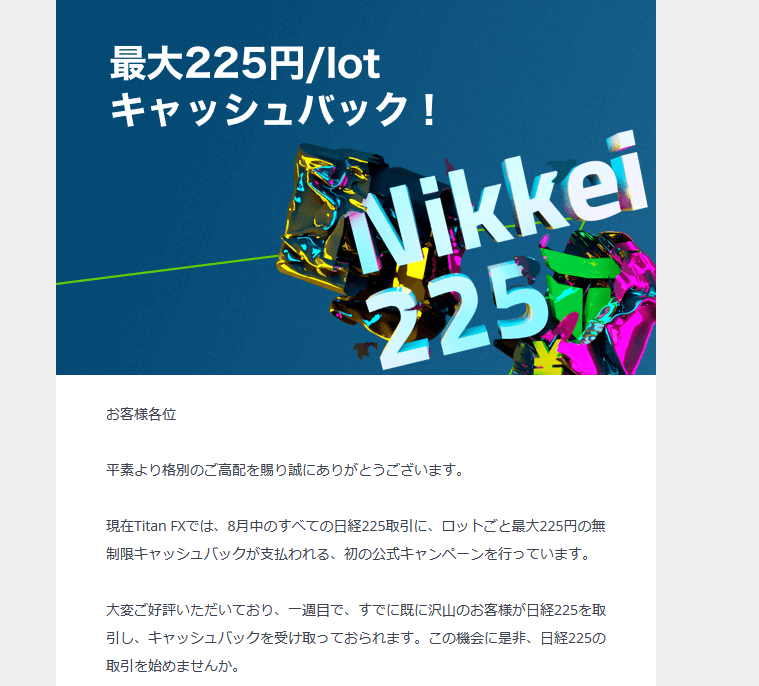 2022年にタイタンFX公式のイベントとして、日経225(日経平均株価のこと)をトレードすると、口座にダイレクトにキャッシュバックされるキャンペーンが行われました。(今回は期間限定で終了)