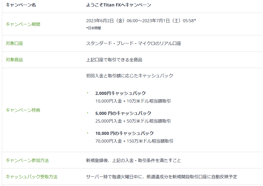 タイタンFXは不定期にキャンペーンが行われるから、公式サイトの情報を見逃さないようにしないといけないね。