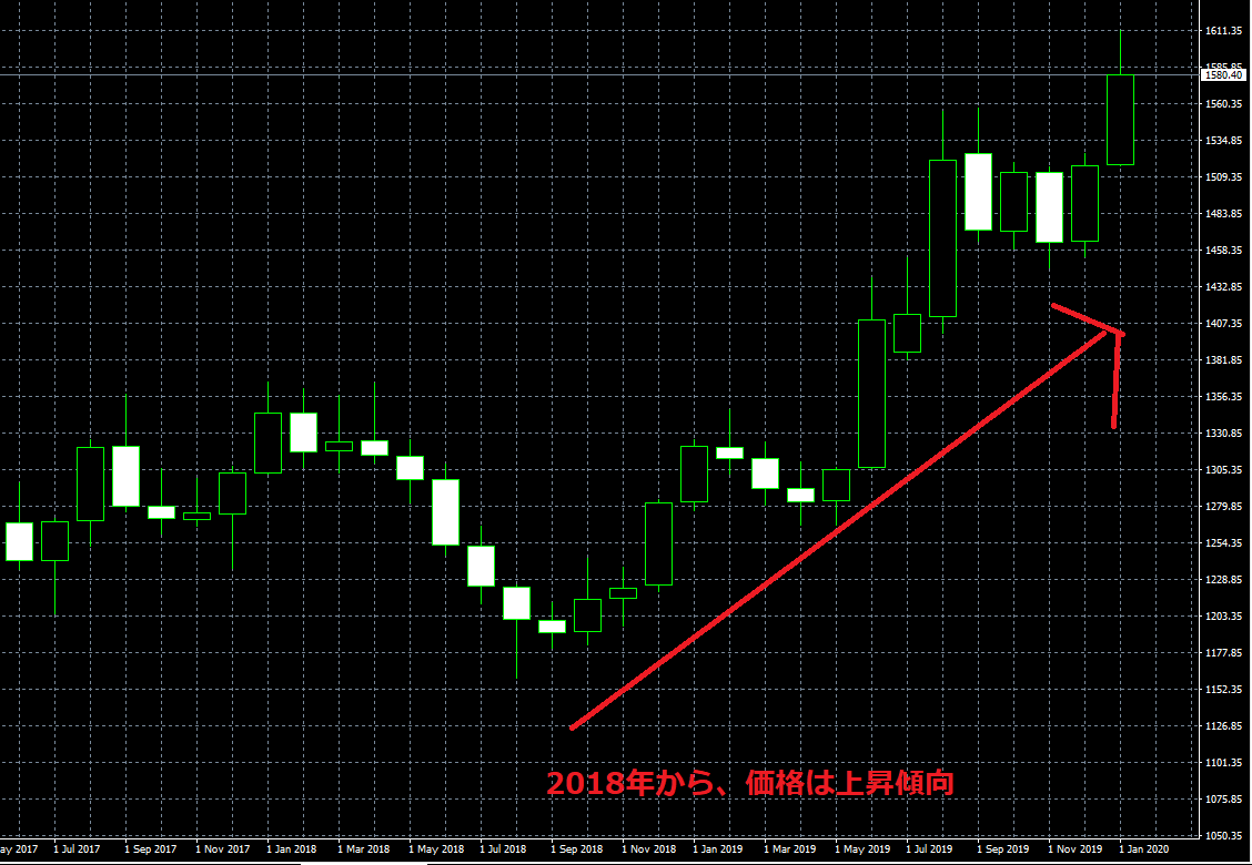金価格は2018年の後半から上昇トレンドが続いています。アメリカと中国の対立や中東情勢、経済情勢などの影響を受ける形で右肩上がりです。