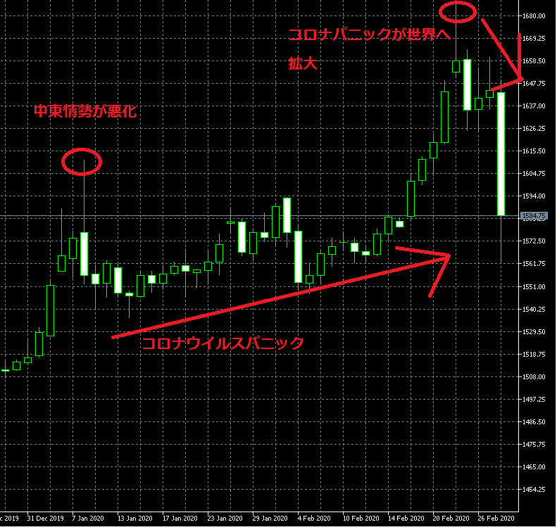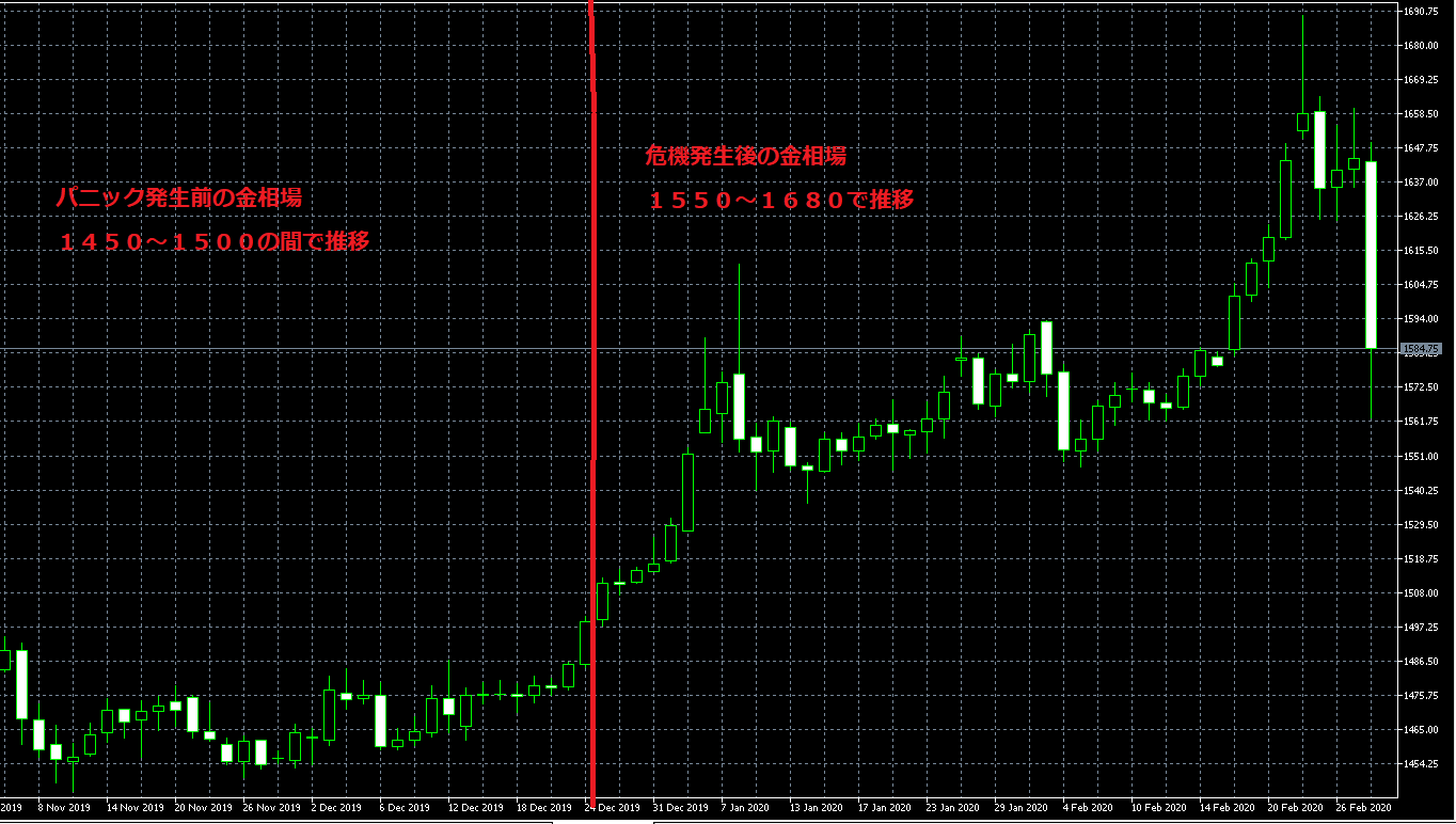 なぜ金が下がり始めたのかについては諸説あると思いますが、パニックの発生により大きな株安が起きたことにより、投資家の手持ちの現金が不足してしまい、手持ちの金を売って現金を確保しようとする流れが出たようです。